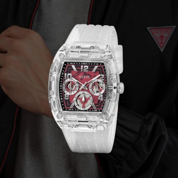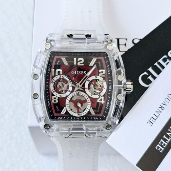 ✅ The Guess GW0499G9 Phoenix Men’s Watch combines bold design with modern functionality. Featuring a rich burgundy dial encased in a transparent polycarbonate barrel-shaped case, this timepiece stands out with its unique aesthetic.
