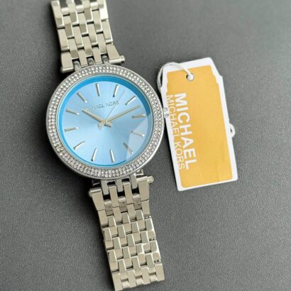 A turquoise mother-of-pearl dial trimmed in pavé crystals adds feminine sparkle to the glamorous stainless-steel Michael Kors Darci watch.